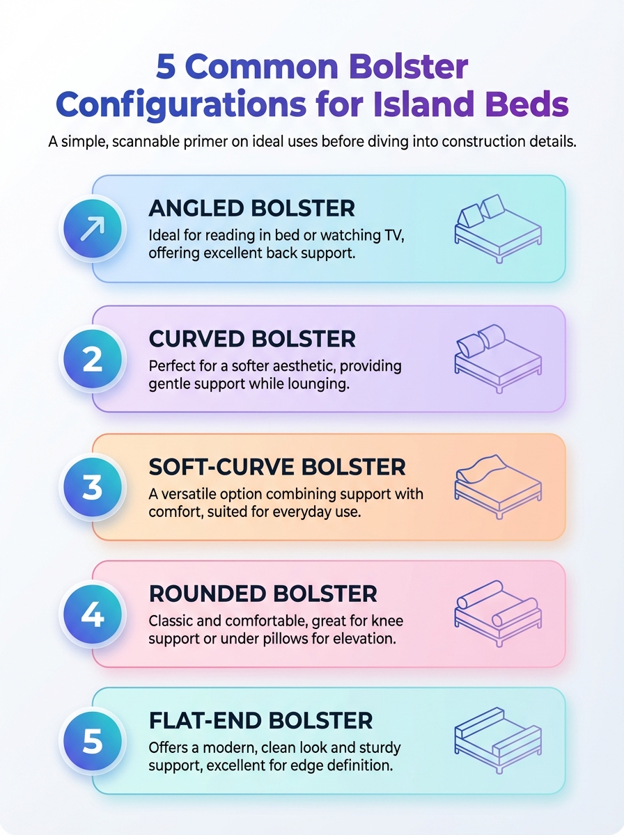 This infographic visualizes the five most common bolster configurations for island beds. It highlights how each setup supports comfort and space.